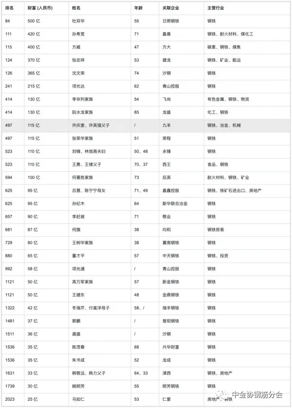 2020年10月20日,全球最大的财富榜排榜机构胡润研究院联合发布《2020衡昌烧坊·胡润百富榜》,这是胡润研究院自1999年以来连续第22次发布“胡润百富榜”。今年有30位钢铁行业的企业家入围榜单,日照钢铁杜双华以500亿财富成为钢铁行业首富。