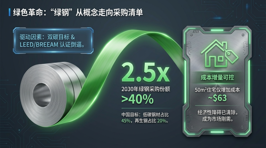 全球“双碳”目标及绿色建筑认证体系(如LEED、BREEAM)正在下游传导压力,使低碳排钢材成为明确的市场需求。