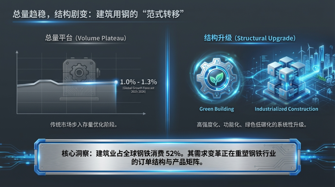 正如汽车行业所揭示的范式,建筑行业的用钢需求演变同样呈现出“总量平台趋稳、结构剧烈升级”的核心特征。全球建筑领域作为钢铁消费占比超52%的最大下游,其需求变革正深刻重塑钢铁行业的订单结构与产品矩阵。这一变革并非简单的数量增减,而是在绿色建筑浪潮、工业化建造转型及全球区域政策分化的多重力量驱动下,向着 高强度化、功能化与绿色低碳化 的系统性升级。