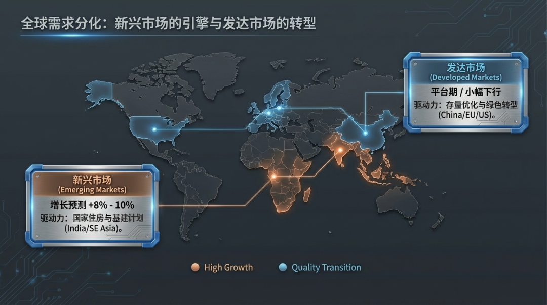 新兴市?。汗婺T龀ぶ鞯迹⌒枨笸?。印度、东南亚、非洲等地推出的国家级住房与基建计划(如印度“全民住房计划”),是其钢铁消费保持8%-10%高速增长的核心驱动力。这些市场当前仍以拉动钢材需求总量为主,但新建项目标准正逐步向高性能材料看齐。