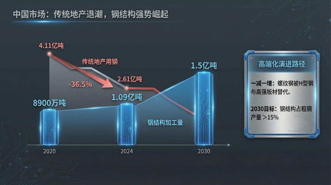 传统建筑用钢萎缩 :受房地产深度调整影响,地产用钢需求预计从2020年的 4.11亿吨 大幅降至2025年的 2.61亿吨 (降幅达36.5%)。