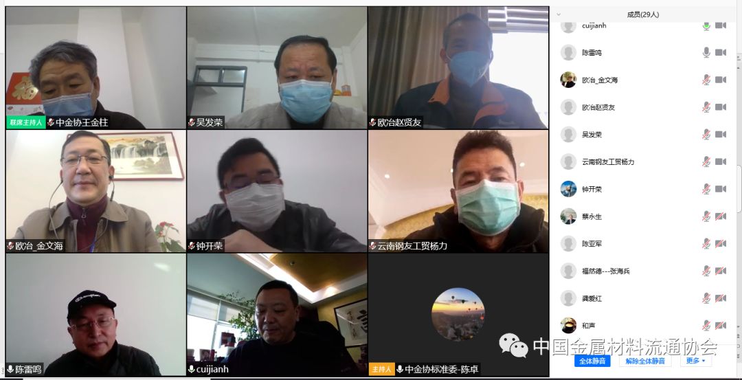 2020年3月5日上午,由中国金属材料流通协会立项的《板材加工中心建设与管理规范》团体标准线上启动会议顺利召开。来自欧冶云商、福然德股份、国机铸锻、山钢股份莱芜分公司、山西同元、云南钢友、五矿钢铁、五矿贸易等起草单位主要领导及有关企业代表近四十人出席了会议。