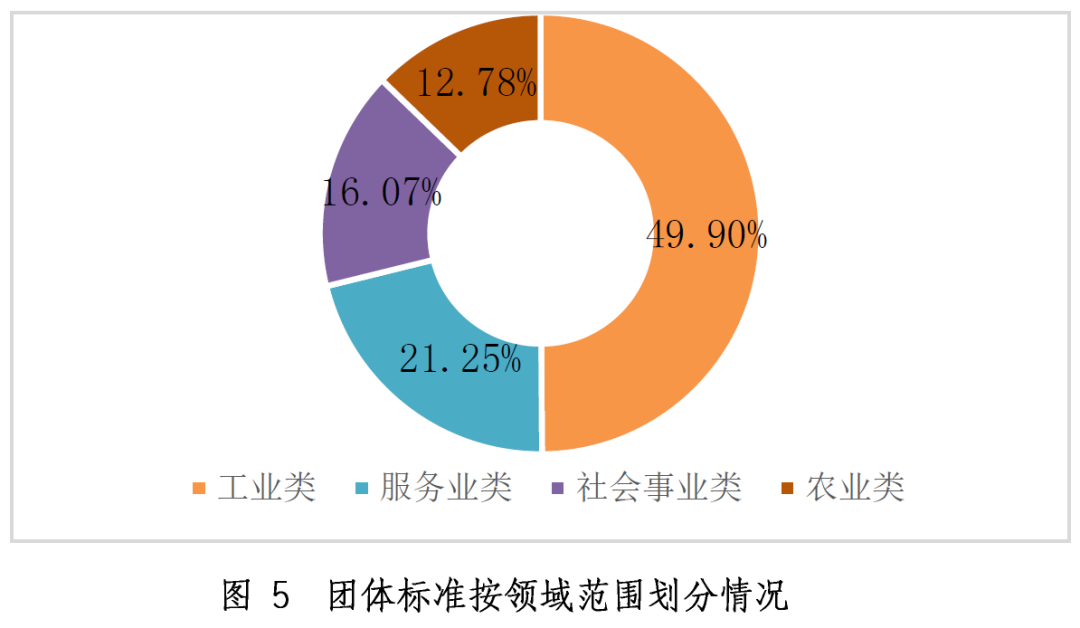 截至2019年12月底,共有3042家社会团体在平台注册,平台上共公布12195项团体标准。按领域范围统计,其中农业类标准1558项,占比12.78%;工业类标准6085项,占比49.90%;服务业类标准2592项,占比21.25%;社会事业类标准1960项,占比16.07%。分布情况见图5。
