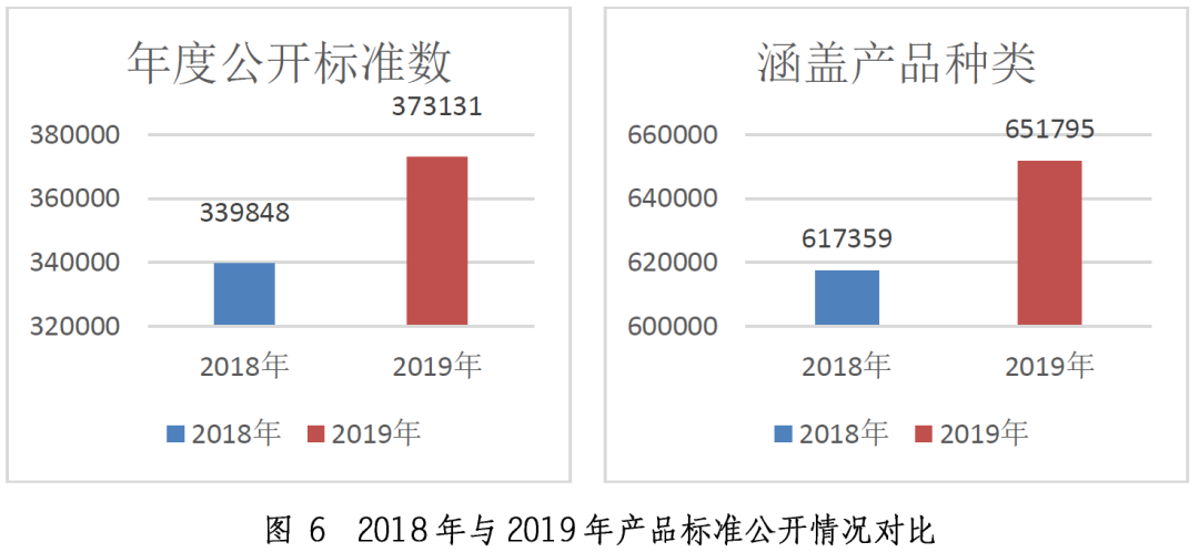 2019年,企业标准信息公共服务平台(本节简称平台)新注册企业55962家;通过平台自我声明公开企业标准373131项,涵盖产品651795种。与2018年相比,平台2019年度注册企业数减少5228家,年度公开标准数增加33283项,涵盖产品种类增加34436种,具体情况见图6。