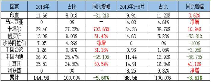 土耳其:2019年批量到货3次,每次5万吨左右。1-8月总抵港量14.91万吨,同比增14.91%。实际上,土耳其国内以及出口市场销售持续低迷,尤其受到欧盟钢铁进口保障配额年度螺纹钢配额下降到13.3%的影响,出口市场不得不另寻机会。