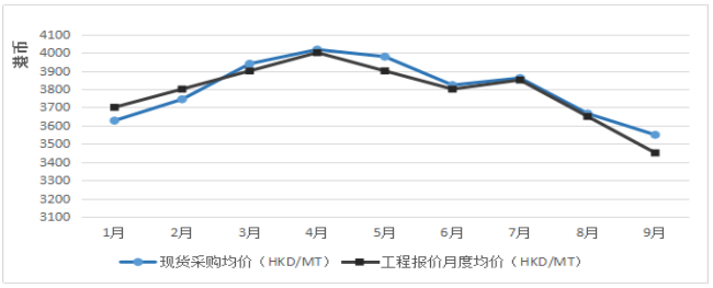 港内工程交易系索价模式基本没有变化,建筑行业需求的低迷导致自3季度开始工程报价大幅下降,2019年月度工程价格震荡区间见图二。其中,一季度港内工程报价随全球钢价缓慢回升,二季度震荡下行,三季度则急速下滑,前三季度整体下跌速率快过采购成本价格跌速。截至10月8日,工程报价最低达到了3400港币/吨。计入进仓、吊装等费用,现货亏损程度在100港币/吨上下。