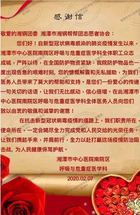 截至目前,华菱湘钢从韩国、泰国、新加坡、德国等国家采购200多万元疫情防护用品;累计向湖南省红十字会捐赠口罩2万个、防护服5516套;支援湘潭市中心医院、湘潭市第一人民医院防护口罩4万多个、防护服3470套;支援岳阳市红十字会消毒液5吨;派出设备检修人员驰援湖南臻和亦康医疗用品公司,及时修复2条口罩生产线,派遣16名缝纫技师支援生产,保障了应急物资的顺利供应;湘钢团委组织了“抗击疫情”线上募捐活动,发动全体职工、职工家属和离退休职工向湖南、湖北疫区进行募捐,三天内筹集捐款66万元,并全部转给湖南省青少年发展基金会。
