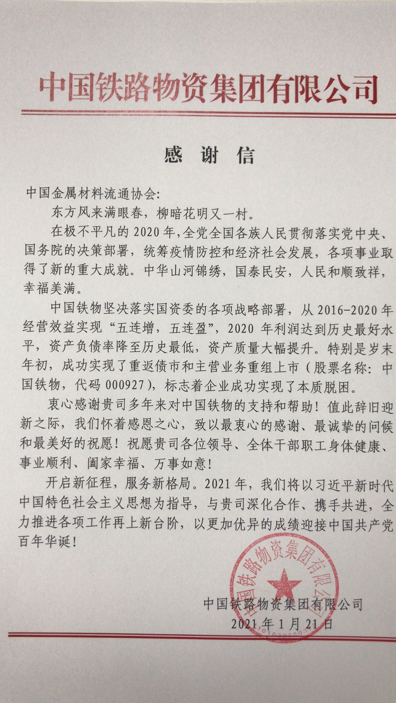 近日,中国金属材料流通协会副会长单位、中国铁路物资集团有限公司向中金协发来感谢信,感谢协会的帮助和支持。