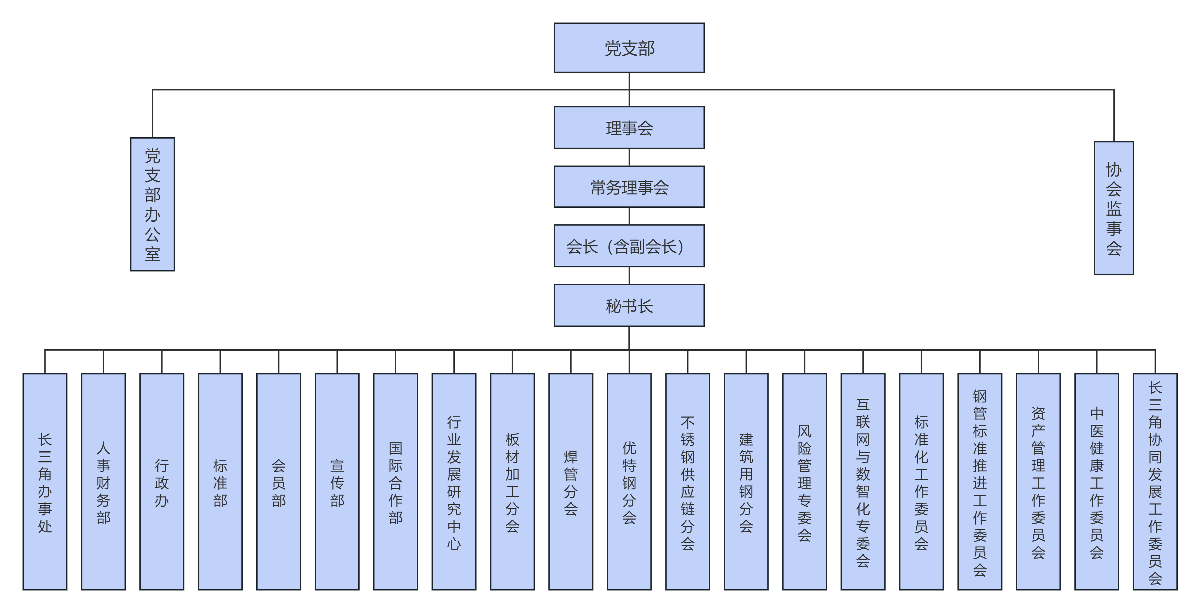本会拥有板材加工分会、焊管分会、建筑用钢分会、不锈钢供应链分会、优特钢分会、风险管理专委会、互联网与数智化专委会、标准化工作委员会、资产管理工作委员会、中医健康工作委员会、钢管标准推进工作委员会等分支机构,拥有团体会员单位(省市商协会)近40家。